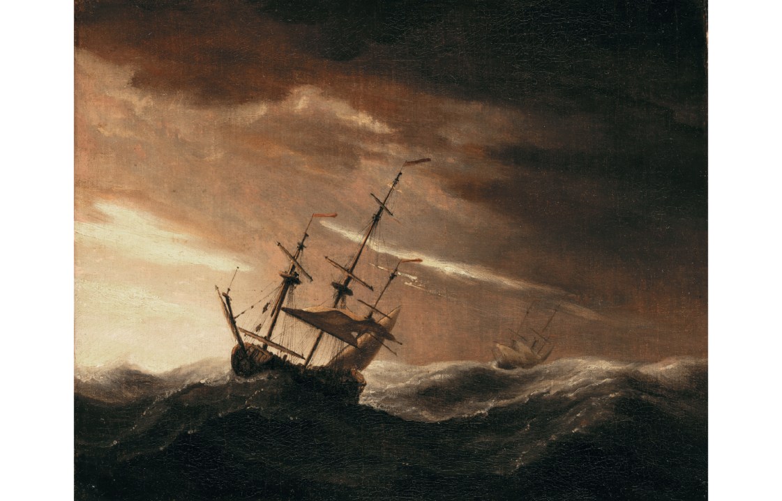 The Van de Veldes worked as a team. The draughtsman father specialised in ‘pen painting’, a technique well suited to intricate rigging and lavish stern decorations that made 17th-century warships look like floating carvings by Grinling Gibbons; the painter son excelled at atmospheric effects. Dutch patrons had appreciated his light airs; the English preferred gales. A Thames waterman took him out sketching skies in all weathers, an activity the Dutchman called ‘going skoying’. The Van de Veldes never seem to have mastered the English language, but they introduced their adoptive country to marine art: Turner claimed that an image of a storm-tossed vessel by Willem the Younger had made him a painter.