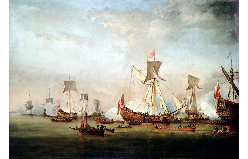 In March 1675 the Keeper of His Majesty’s Lodgings at Greenwich received an order for ‘Three pairs of shutters for the three windows in a lower room, at the Queen’s building next to the park (where the Dutch painters work’). Willem van de Velde and his son, also called Willem, would have preferred a studio with north light, but they weren’t complaining. They had been put on a retainer of £100 a year by Charles II – with an additional £50 from James, Duke of York – for the father to draw ‘Draughts of Sea Battles’ and the son to turn ‘said Draughts into Colours’.