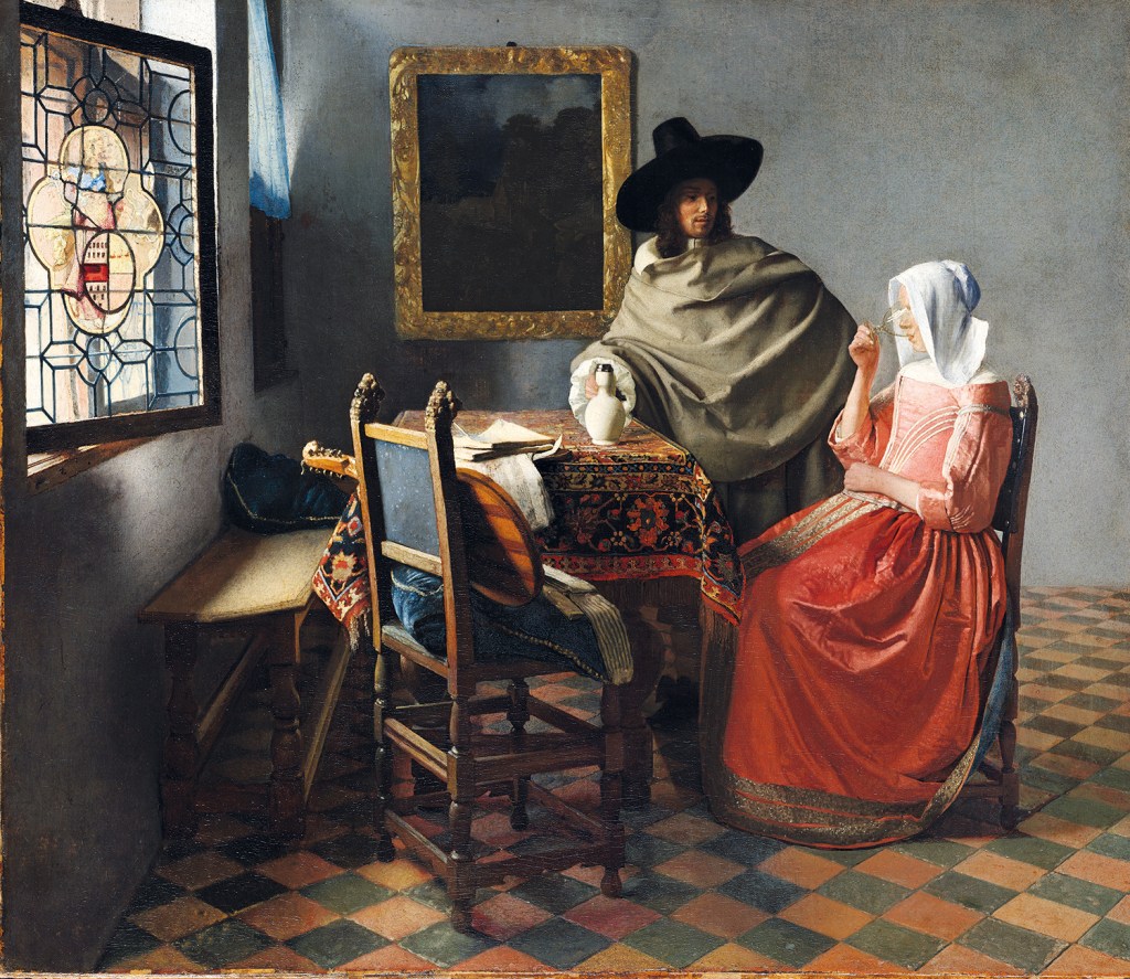 Like other artists in the Dutch Republic Vermeer painted for the open market, and his images of women spiced with hints of romance would have appealed to female buyers at a time when the ladies of the house chose the furnishings and paintings. His women idling in domestic settings are unburdened by household chores. They are enjoying ‘me time’, a luxury the painter himself can only have enjoyed in his studio on the rare occasions when he got into it. After his father’s death in 1652 Vermeer had taken on his picture-dealing business and pub, the Flying Fox; he let out the pub but carried on picture dealing – probably his main source of income – throughout his life. In 22 years of marriage Catharina bore him 15 children, of whom 11 survived. Even in a largish house they must have lived hugger-mugger: a bankruptcy inventory drawn up in 1675 after the 43-year-old artist’s sudden death from a ‘frenzy’ possibly triggered by money worries records that his paint-grinding table shared the attic with 13 drying racks for the family laundry.