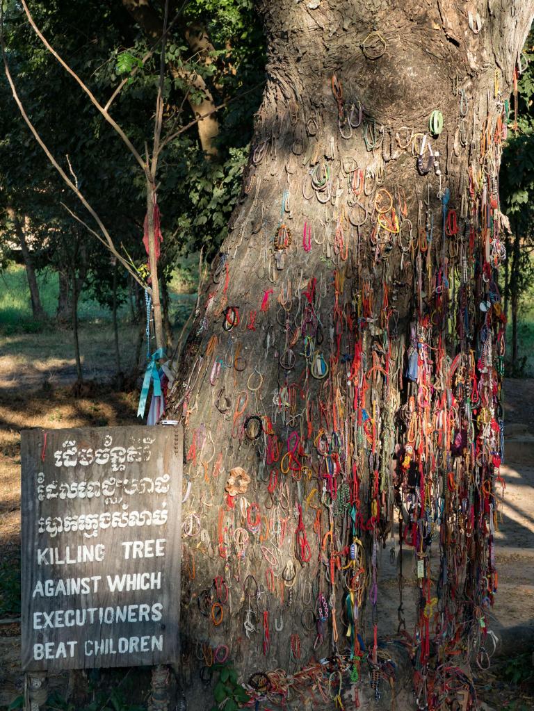 But if you look close at the bark of this tree, you can see tell-tale abrasions: chops, scars, bruises. These blemishes mark the places where peasant soldiers would swing screaming children against the tree, smashing their skulls to pulp. This was done, quite deliberately, in front of their naked, wailing and soon-to-be-murdered mothers. Because this is the infamous Baby Bashing Tree, in the Khmer Rouge Killing Fields of Choeung Ek.