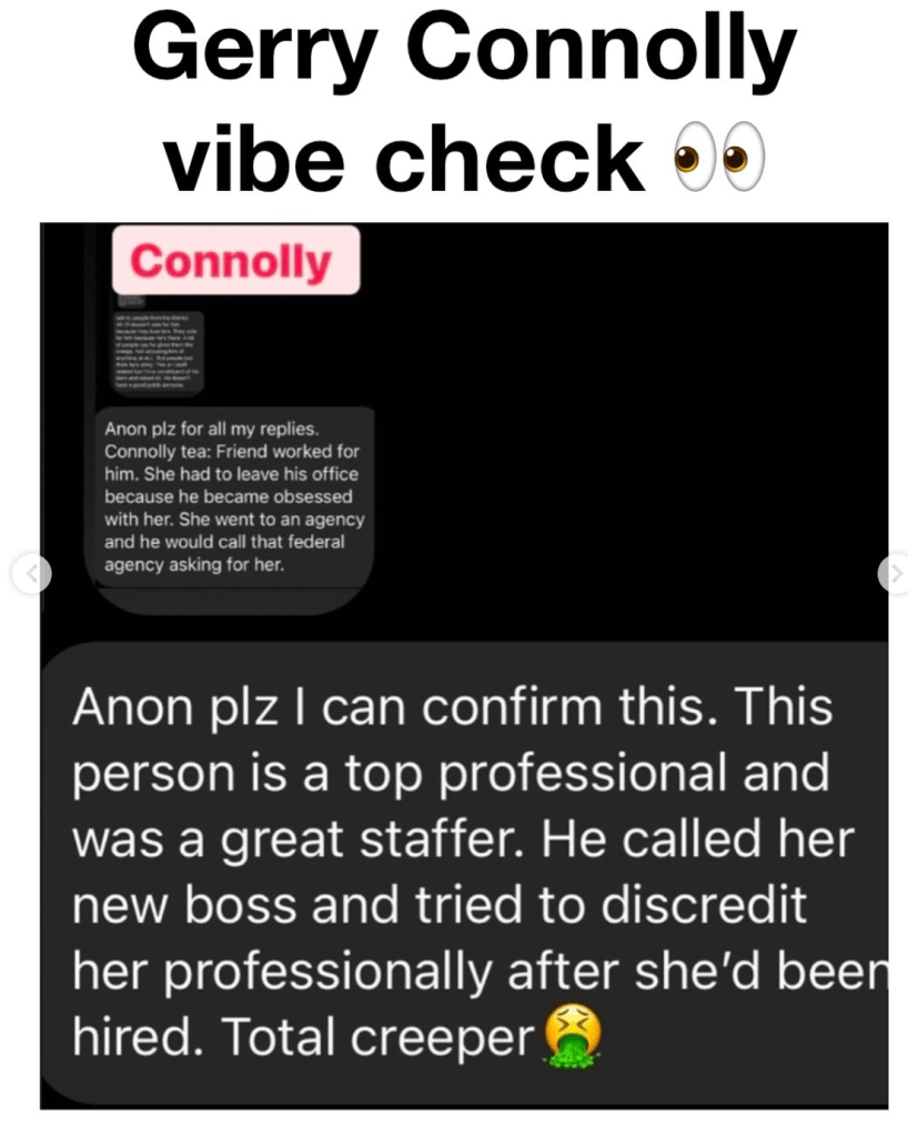 Perhaps the group most disappointed by AOC’s defeat, and by Connolly specifically being chosen to run the Oversight Committee Democrats, are the commenters on the Dear White Staffers blog. The page is riddled with “antisemitic” and anti-Israel content — and a recent post filled with anonymous attacks on Connolly that called him a “total creeper” and a diva. Several posts attacked him for his Covid-era policies, where he made his staff work in person despite supporting lavish telework policies for others in the federal government.