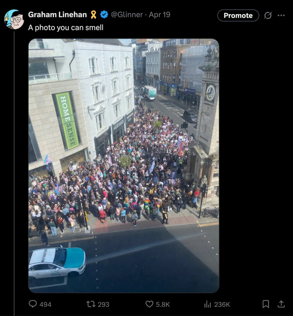 The police themselves, for the most part, were consistently decent throughout this farce. Some were even Father Ted fans. Thank God the Catholic Church never had with the police the special relationship granted to trans activists. The male officers were mostly polite but clearly nonplussed by the politics of it all – just doing their jobs, however insane those jobs had become. The female officers seemed more tuned in to what was actually happening. One mentioned the Sandie Peggie case in a certain way, and I realised I was among friends, even if they couldn’t admit it.