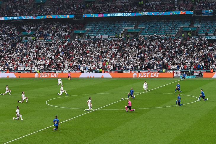 In retrospect, that seems pretty obvious. Professional footballers, who tend to be multi-millionaires, drive expensive cars and have young children, do not want to end capitalism, defund the police or dismantle the nuclear family. But like Guto, I had difficulty getting past my initial reaction to seeing them taking the knee because in my mind the gesture is linked to BLM — an impression reinforced by Premier League players wearing BLM badges on their shirts last year and football clubs unfurling huge banners in their stadiums saying ‘Black Lives Matter’. However, I now accept that when players start taking the knee again in a few weeks’ time — the first Championship game is on 6 August — it will not be because they’re rabid neo-Marxists.