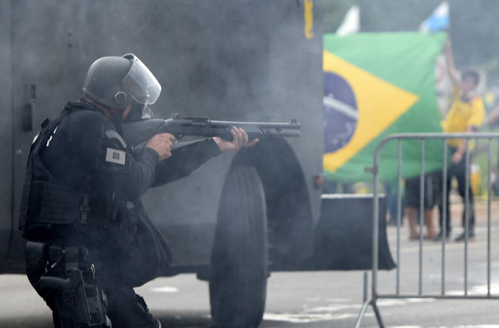 A member of Brazil’s security forces aims at the Planalto Palace. Protesters were said to be armed with some reported to have stolen guns from within the presidential palace.