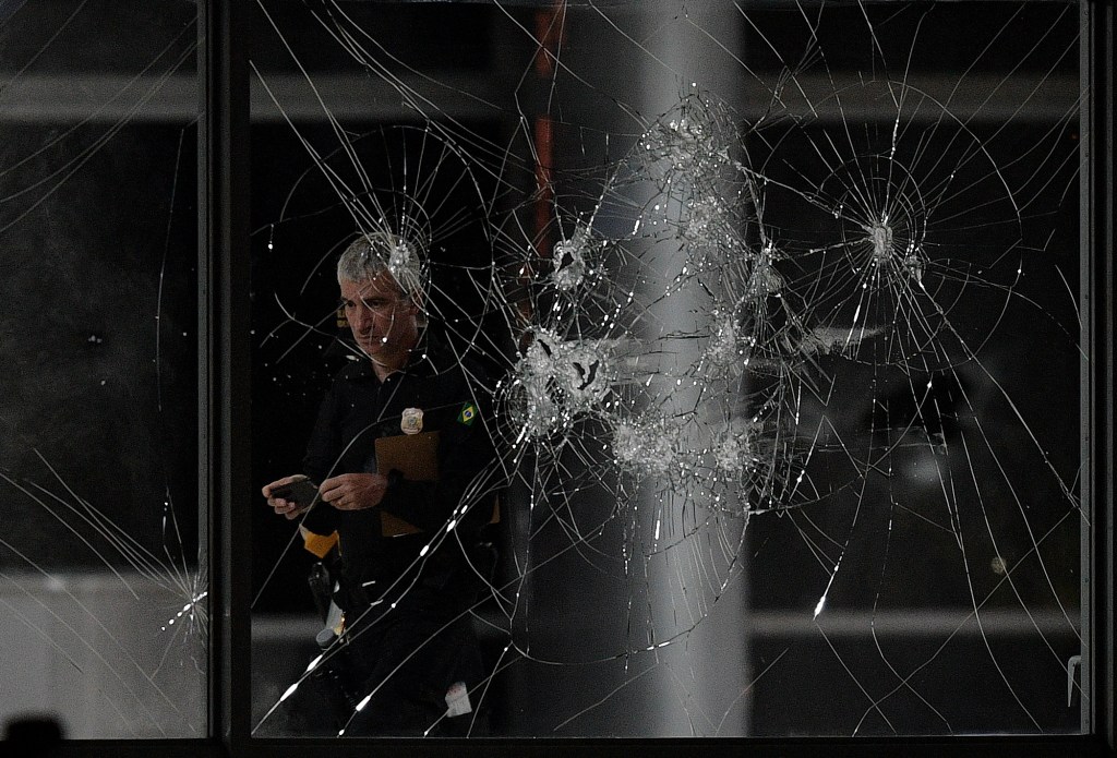 A policeman inspects damage to the Planalto Palace. The authorities restored control around 6:30 p.m. local time. Local curfews have been imposed. President Lula inspected the damage overnight.