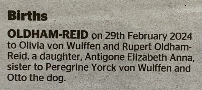 It began, as these things often do, in the Births, Deaths and Marriages column of the Times. ‘On 29th February, to Olivia von Wulffen and Rupert Oldham-Reid,’ the announcement read. ‘A daughter, Antigone Elizabeth Anna, sister to Peregrine Yorck von Wulffen and Otto the dog.’ The ad was spotted by journalist Harry Wallop who posted it on social media last week without comment – but plenty of comment would follow, much of it negative. I think that shows a sad lack of imagination.