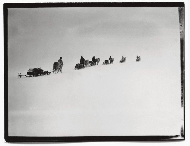 But Wilson points out that Scott was also informed by Victorian picturesque landscape conventions. I would go one further and say that a short line can be drawn from Breughel’s snowscapes to Scott’s action photos. In Scott’s compositionally assured late shots, he understands that the often perfect nullity of the Antarctic landscape vivifies human subjects. There is a warm heart behind Scott’s 13.6 kg lug of a camera. The most successful shots here are the ones of the men at repose, dwarfed by gulps of mountain, ice and sky. We might be footnotes to the story of nature, but we can command a presence while we’re here.