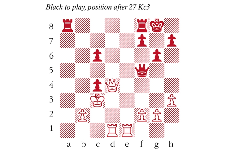 1 e4 c6 2 Nf3 d5 3 Nc3 g6 4 d4 Bg7 5 h3 Nf6 6 Bd3 dxe4 7 Nxe4 Nxe4 8 Bxe4 Nd7 9 c3 O-O 10 Bg5 Qc7 11 Qd2 e5 12 O-O-O exd4 13 Nxd4 Nc5 14 Bc2 Ne6 15 Nxe6 Bxe6 16 Bb3? Awful. 16…Bxb3 17 axb3 a5! Taking a crowbar to the queenside. 18 Qf4 Qb6 19 Kc2 Qb5 20 c4 Qc5 21 Bf6 Bxf6 22 Qxf6 a4 23 Qd4 Qf5+ 24 Kc3 axb3 25 Kxb3 b5 26 Rhe1 bxc4+ 27 Kc3 (see diagram) Rfb8 27…Qa5+ 28 Kc2 Qa4+ 29 Kc1 Qb3 was simpler. 28 Qxc4 Ra5 29 b4 Ra3+ 30 Kb2 Ra4 31 Kb3 Raxb4+ 32 Qxb4 Rxb4+ 33 Kxb4 Qxf2 34 g4 Qb2+ 35 Kc4 Qc2+ 36 Kd4 c5+ 37 Kd5 c4 38 Rh1 Kg7 39 Kd4 Kh6 40 Kc5 c3 41 Kc4 Kg5 42 Rc1 Qd2 43 Rxc3 Fifteen forgettable moves later, a draw was agreed.