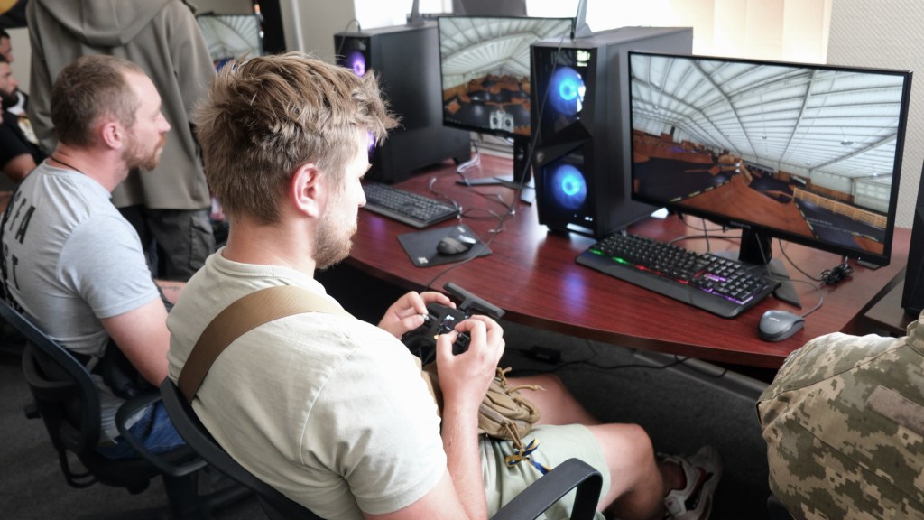 We enter a room with seven computers where 20 students are training to fly drones using simulators. They learn in 20-minute sessions and spend two weeks practising on computers. In week three, soldiers are taken to fields outside Kyiv for target practice with real drones. There’s a weekly exam, and anyone who fails it is removed from the school.