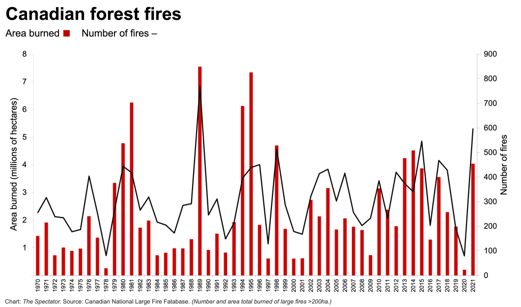 As for the issue of ignition sources, it is notable that the year with the fewest wildland fires and the smallest area burned of all the past 40 years was 2020 – a year when, thanks to the pandemic, there were fewer people out and about, holding barbecues in the woods and such like. It is little wonder that 2021 was an especially bad year for fires, when, as well as hot, dry weather in British Columbia, life returned a little more to normal and areas which might have burned in 2020 burned in 2021 instead.