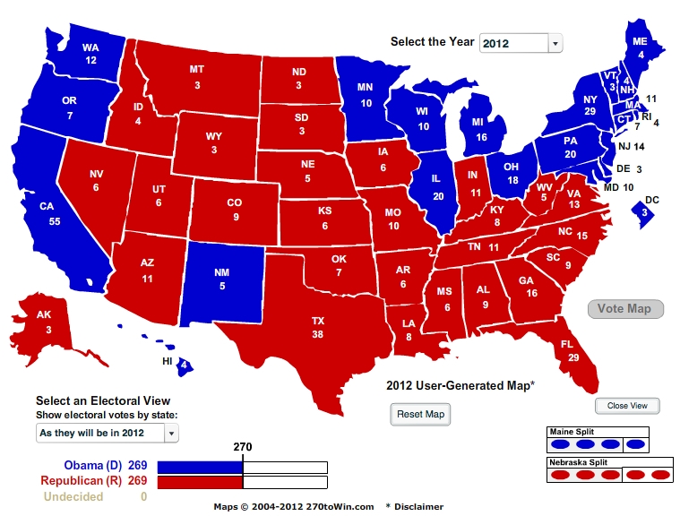 The map at the top of this post – compiled at 270 To Win – shows how Romney could squeak an electoral college tie and send the election to the House of Representatives. That result is necessarily improbable but it’s just one illustration of how narrow Romney’s path to victory really is.