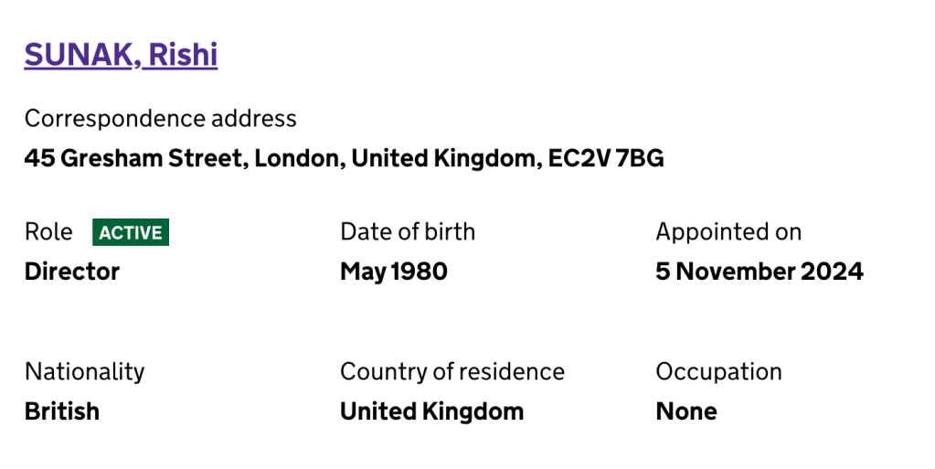 It’s less than a week since he formally handed over the reins of power – but Rishi Sunak is wasting no time. On Wednesday, just five days after he formally resigned the leadership of the Conservative party, Sunak and his wife Akshata registered their latest venture on Companies House. The newly-incorporated ‘Office of Akshata Murty and Rishi Sunak Limited’ follows similar vehicles being set up by Sunak’s four Tory predecessors. David Cameron, Theresa May, Boris Johnson and Liz Truss all established their own eponymous outlets shortly after leaving office.