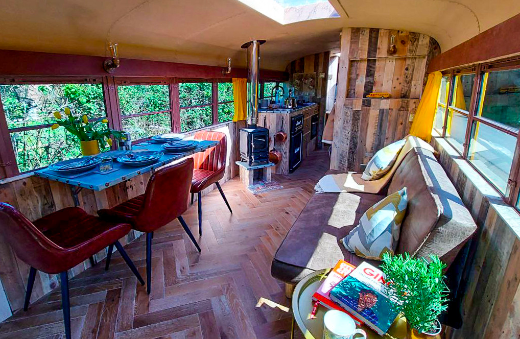 Thankfully American School Bus Glamping have converted their buses to a somewhat higher spec. If you stay in the one at Church View you can gaze out at the campsite’s splendid collection of activities (assault course, escape room, axe-throwing and the like). If you don’t fancy using the kitchen or barbeque, there’s an on-site Thai restaurant, or fish and chips from the nearby village.