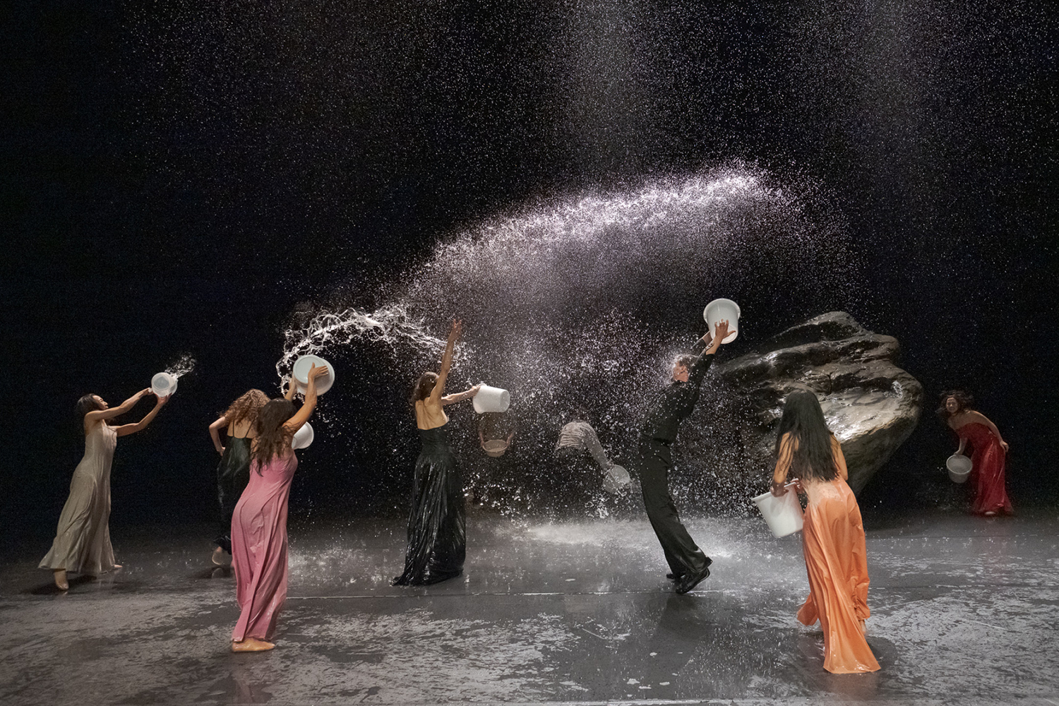 With an intolerable duration of well over two hours, Vollmond contains many of her familiar tropes, and then some: a set consisting solely of a large, immovable stone boulder against a black background; downpours of rain cascading from the flies forming a shallow pool in which the cast frolic, splash and slide; outbursts of frenzied emotion and nonsensical spoken monologues lacking what T.S. Eliot described as an ‘objective correlative’ or reasoned connection to anything else; tediously repetitive rituals that involve odd noises or pointless rules; men running at great speed across the stage into the wings, women floating about in ballgowns and stilettos; a lot of panic, a lot of robotic parading, a lot of discarding of clothes. No relationships or continuities are established; the principle seems to have been to give rein to the first thing that comes into the performers’ heads, a surrender to instinct and the unconscious.