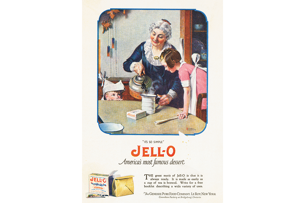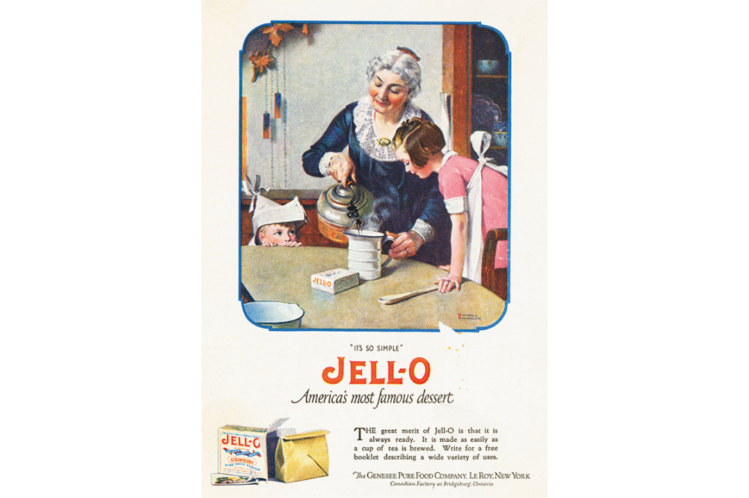 Industrial production in the 19th century changed all that. Powdered gelatin made the once-elaborate process accessible to home cooks, and Victorian recipe books embraced molded jellies as marks of modernity. Copper molds became common wedding gifts – a well-set jelly signaled competence and care. In 1897, Pearle Wait of Le Roy, New York, combined industrial gelatin, sugar and fruit flavorings. His wife named the result “Jell-O.” The Waits sold the trademark to local entrepreneur Orator Woodward, whose recipe booklets, magazine ads and traveling demos carried it across the country.
