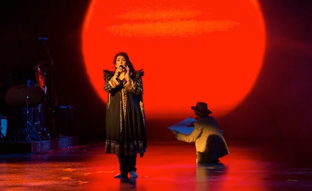 Well, at first the answer seemed to be by doing the most unexpected thing of all: serving up a bog-standard rock concert. The lights dimmed, the cheers resounded and on she came to give us a rather workmanlike performance of well-liked album tracks interspersed with the classic hits ‘Running up that Hill’ and ‘Hounds of Love’. At this point, even the choreography consisted of little more than a barefooted Kate shuffling about a bit, and attempting the odd gingerly twirl. But then after a rousing ‘King of the Mountain’ — a definite early highlight — the show suddenly and dramatically changed.