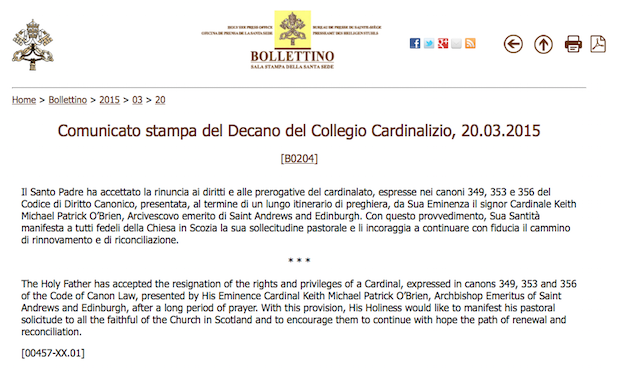 Keith O’Brien, former Cardinal Archbishop of St Andrews and Edinburgh, was today stripped of the rank of cardinal by Pope Francis. Technically he has resigned. But the statement above leaves us in little doubt that O’Brien has had the red hat forcibly removed from him. He’s the first cardinal to lose his title since Louis Billot, a French Jesuit who resigned as cardinal in 1927 in protest at the Church’s condemnation of the far-Right anti-Semitic Action Française movement. Billot was the only cardinal to resign in the 20th century. [Update: see discussion in the thread over O’Brien’s title. This he has not lost, de jure, but de facto he is no longer a cardinal and I suspect Rome will come down on him like a ton of bricks if he clings on to it.]