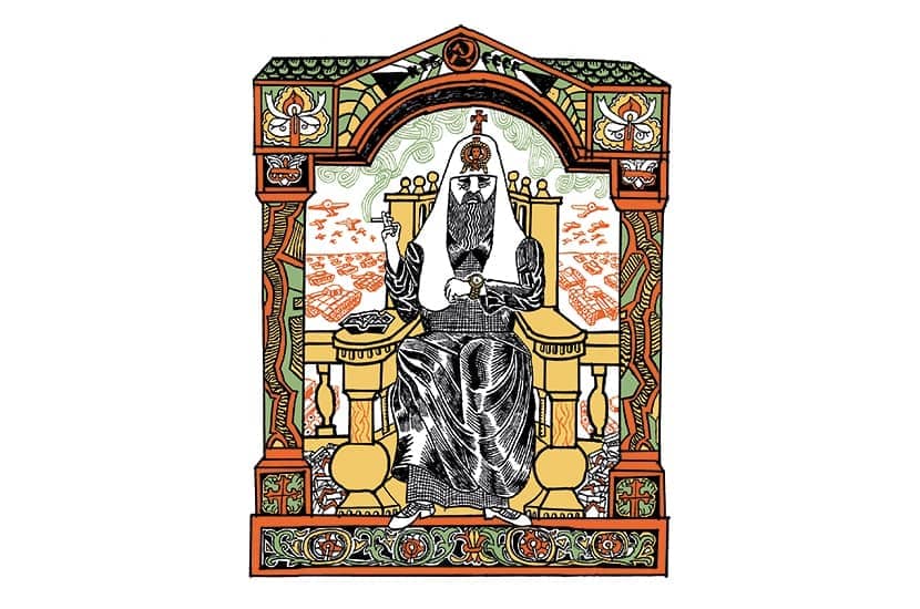 On his head Kirill is wearing a white koukoulion, the so-called ‘helmet of salvation’, with side flaps like the ears of a giant basset hound. But his cassock is plain black and his wrist is bare. Only the polished table reveals the glimmer of his phantom wristwatch, a £20,000 Swiss Breguet.