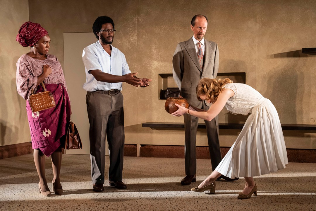 Beneatha’s Place, set in the 1950s, follows a black couple who encounter racial prejudice when they move to a predominately white suburb. The location is Nigeria but it might as well be the USA because most of the characters, both black and white, are American. (The Young Vic has strong links with America, and a transfer to Broadway may be under discussion.) The script by Kwame Kwei-Armah is inspired by the British sitcom Love Thy Neighbour, which aired five decades ago. This misunderstood show was pretty progressive for the 1970s, and it examined the conflict between two thick white bigots living next door to an intelligent and sophisticated couple from the Caribbean.