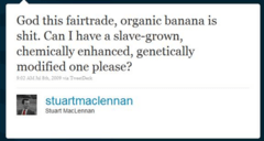 Gordon Brown is heading to Scotland today and it is hard to see how he can avoid the story of the Labour candidate for Moray and his Tweets. Forget Stuart MacLennan’s foul language, it’s the mindset that his messages reveal that is truly shocking. Take this one from July 8th:“God this fairtrade, organic banana is shit. Can I have a slave-grown, chemically enhanced, genetically modified one please?”