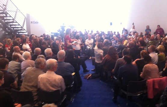Not that the audience were right-wing. One woman said the Tories would rather the young were left to rot on the dole, rather than find work. Derbyshire picked her up on this: do you really think so? She did. The audience seemed to me to represent what is now the largest single (and most neglected) force in British politics: the abstainers. More people now stay away than voted for the winning party, something that never happened before 2001. “The problem with politics is the politicians,” one man declared, to much applause. When the microphones were turned off, the politicians had a hard time getting out of the room unmolested. Even the cheery Ben Bradshaw was also tackled by an audience member who ended the conversation by shouting: “You’re on another planet! You’re out of touch.”  One remonstrated with John Denham (picture, below) accusing him of lying with statistics.