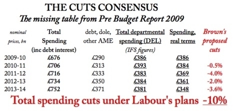 Fireworks at Labour’s press conference this morning, thanks to some brilliant questioning of Mandelson and Balls about the cuts which Labour is concealing from the public. A while ago, the FT did its own version of a table that Coffee House ran in February: the implied cuts that departments will make under HM Treasury forecasts. I reprint it below.