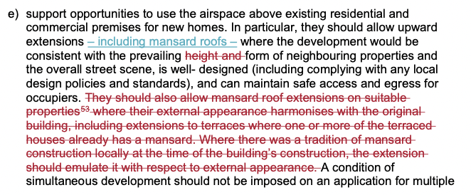 While later in this section, a whole paragraph on how housing would be ‘inappropriate’ if the ‘resulting built form’ is ‘wholly out of character with the existing area’ has been cut. Clearly, this is not of any great importance to Starmer’s army…