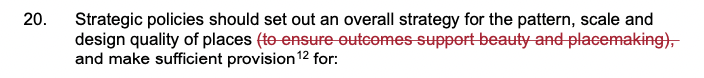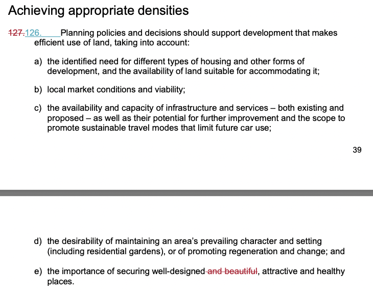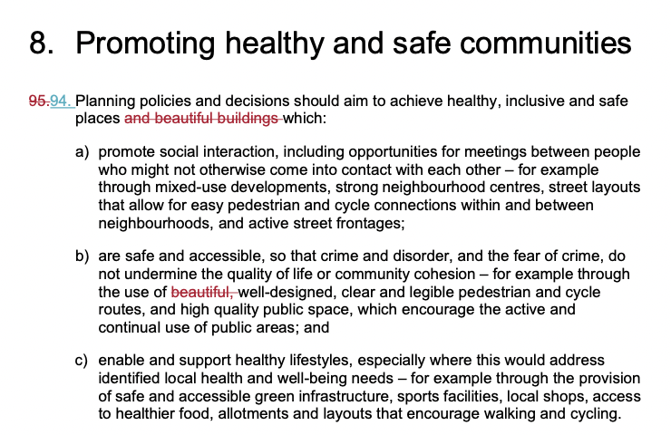 Strategic policies should no longer ensure ‘outcomes support beauty and placemaking’ – and the new version also states that the aim of planning policies should be to ‘achieve healthy inclusive and safe places’, after removing yet another reference to ‘beautiful buildings’…