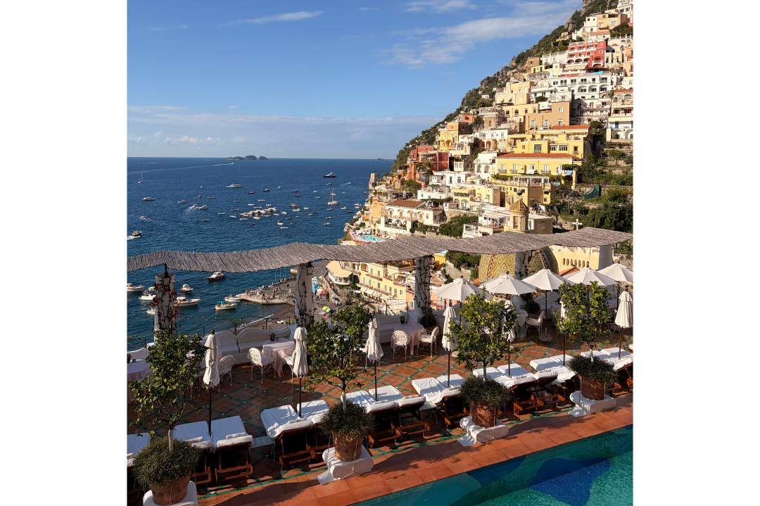 And worth wading through the throngs. Winding staircases and narrow alleyways usher you through this teetering hulk of pastels impossibly perched on a mass of rock jutting out from the sea like a psilocybin-induced miracle. Amidst the smattering of colors stands Le Sirenuse, looming just beyond the sparkling tile dome of the chiesa di Santa Maria Assunta, a 10th century church that, as history tells it, is the site of quite a few miracles of the ecclesiastical sort. From the boats that ferry tourists around the coast, the mention that one is staying at the hotel typically elicits a knowing — and faintly envious — nod. Celebrities can relax here; I spot a linen-clad Jason Mamoa and girlfriend Adria Arjona strolling near the port undisturbed.