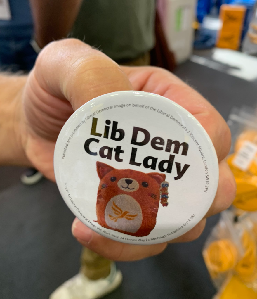 Sadly Mr S missed out on claiming one of these mascots – but did manage to get a photo of one of the newly-minted badges depicting the animal. Buttons bearing the words ‘Lib Dem Cat Lady’ have proved to be one of the most popular items at the party’s merchandise stall, with activists wearing them in part to protest the comments made by Donald Trump’s running mate JD Vance about ‘childless cat ladies.’
