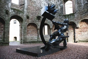 He has even succeeded in updating the classical equestrian state, as he demonstrates again with his latest piece, ‘St George’s Horse’, 2007. This is an age of missiles and dirty bombs so his allegorical steed takes liberties with natural form. Its muscles are as angular as the lines of an armoured car, its tail as cone-like as a rocket’s warhead. In sunlight or floodlight the shadow against the stone lends speed to the flying tail and galloping hooves. All the pieces look at their Wagnerian best when twilight falls and bats flicker in the closing gloom.