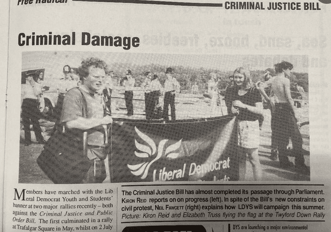 Truss concluded by surveying the fate of her short-changed contemporaries and arguing that ‘only by giving young people a say will this situation be rectified’. She ends by saying that ‘one day discrimination against the young will be acknowledged as the last great barrier to true liberty.’ In the same issue is a picture of Truss protesting the 1994 Criminal Justice Bill, passed by Michael Howard.