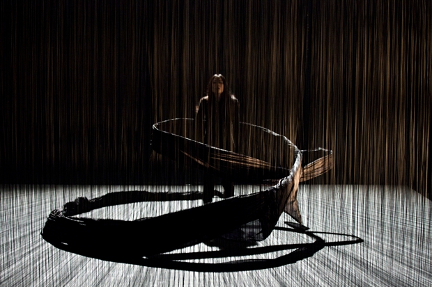 In LIMF you get acrobats, puppetry and circuses, but also some pretty fantastic international lighting artists, video artists and installationists. It’s the marvellously imagined set that made Plexus, Aurélien Bory’s production for the solo dancer Kaori Ito, memorable. An enormous construction that you’d imagine filling the atrium of the Wellcome Foundation, it’s a cuboid room of fine vertical wires, closely threaded in serried rows — in describing which an unfortunate image of Wayne Rooney’s hair transplant keeps coming to me. Or perhaps, think of raining stair-rods, or a thousand spiders spinning only up and down, with Ito, a short strong Japanese woman, totally closed inside this world of thinly pencilled verticals.