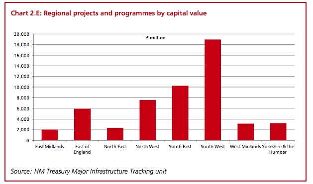 Perhaps that is because the value of infrastructure spending in London comes in at a nifty £36 billion. Or, to put it another way, spending on infrastructure in London is equivalent to the total amount of infrastructure spending in every other part of England save the south-west. And the south-west’s figure is chiefly so high because of a single project: the new nuclear power station at Hinckley Point.