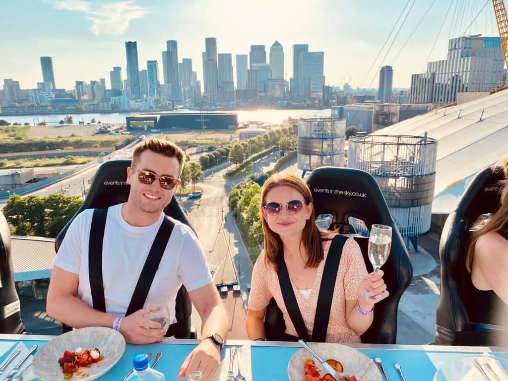 Diners meet just by the O2 arena, are strapped in using three harnesses then wooshed up by crane along with their table for panoramic views over the Canary Wharf, London docks and towards the City. The experience will run this year from 28 April to 20 June.