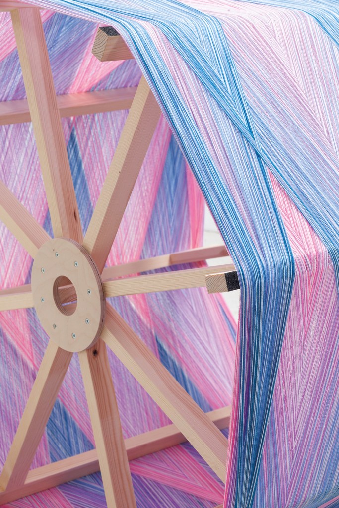 Not all the narratives are sequential. The carnivalesque figures in fibre artist Anna Perach and ceramicist Anousha Payne’s hybrid installation ‘As She Laughs’ (2021) are inspired by the surrealist game of exquisite corpse, while the show’s token male contributors – four out of 21 – eschew narrative altogether. Richard McVetis’s hand-embroidered ‘Variations of a Stitched Cube’ (2017) are speckled with tiny stitches like a collection of square birds’ eggs. Will Cruickshank’s ‘Wound Frames’ (see above), loaded with varicoloured thread using a hand-winding machine powered by a repurposed cement mixer, resemble giant wooden bobbins.