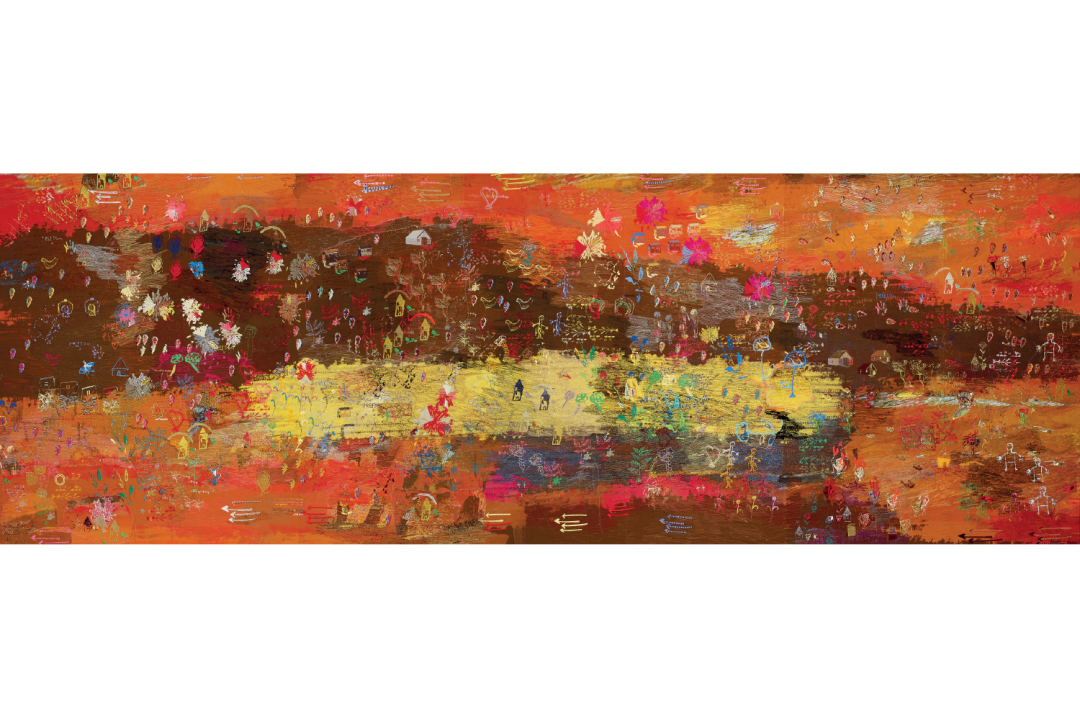 Shoals of these brightly coloured swimmers ply the waves of her eight metre wall hanging ‘Sea’ (2018) in Bishopsgate, while a procession of planes crosses the skies of ‘Flightlines’ (2022) in Fenchurch Street. Her images describe a world in flux. The colours and textures are rich – there’s plenty of gold thread – but the drawing is naive: it’s ‘raw art’ tapestry with an opulent touch. Her compositions, she admits, are ‘very unstructured’; like the stories, mythological or topical, that inspire them they follow ‘a fluid process of development’.