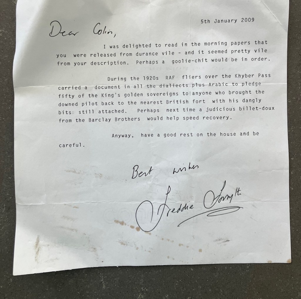 Dear Colin, I was delighted to read in the morning papers that you were released from durance vile – and it seemed pretty vile from your description,’ he wrote (referencing, I think, my account of wearing the same clothes for 40 days). ‘Perhaps a goolie chit would have been in order.