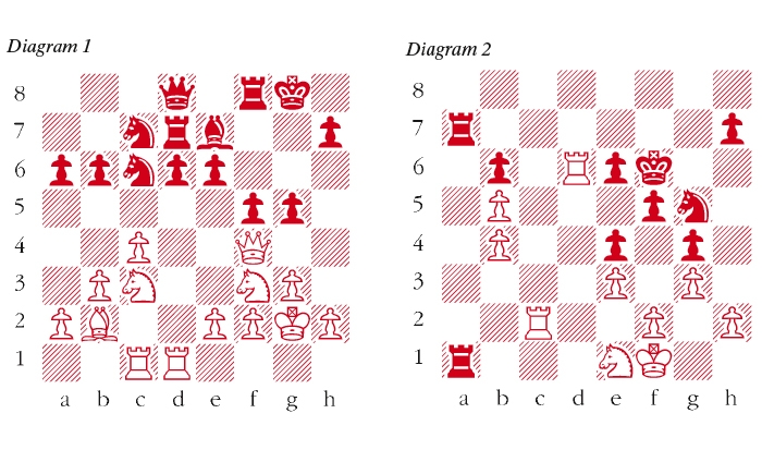 1 Nf3 Nf6 2 c4 e6 3 Nc3 c5 4 g3 b6 5 Bg2 Bb7 6 0-0 Be7 7 d4 cxd4 8 Qxd4 d6 9 Rd1 a6 10 Ng5 Bxg2 11 Kxg2 Nc6 12 Qf4 0-0 13 Nce4 Ne8 Better than 13 … Nxe4 14 Qxe4 Bxg5 15 Bxg5 Qc7 16 Bf4 when White continues to exert slight yet nagging pressure, G.Amann-A.Kranz, Goetzis 1997. 14 b3 Ra7 15 Bb2 Rd7 16 Rac1 Nc7 17 Nf3 f5 18 Nc3 g5 (see diagram 1) This is the plan inaugurated with 16 … Nc7. It appears to weaken the black king but White is not really in any position to exploit this. 19 Qd2 g4 20 Ne1 Bg5 Carlsen forces e3, which weakens f3 and all the light squares around White’s king. 21 e3 Rff7 22 Kg1 Ne8 23 Ne2 Kramnik clears the long diagonal and perhaps prepares a knight transfer to f4, at the cost of weakening e4 further. 23 … Nf6 24 Nf4 Qe8 25 Qc3 Rg7 26 b4 Kramnik, sensing the storm coming, hurries with a central pawn counter. 26 … Ne4 27 Qb3 Rge7 28 Qa4 This plan is too slow. White is fine after 28 h4. 28 … Ne5 29 Qxa6 This is very bad. White should just admit he has taken a wrong turn and do an about face. 29 Qb3 is psychologically difficult to play but keeps the white disadvantage to a minimum. 29 … Ra7 30 Qb5 Not 30 Qxb6 Reb7 31 Qd4 Bf6 and White loses material. 30 … Qxb5 31 cxb5 Rxa2 Black is much better in this endgame as his knights are very active and he can plan a kingside advance. 32 Rc8+ Kf7 33 Nfd3 Bf6 34 Nxe5+ dxe5 35 Rc2 Rea7 36 Kg2 Ng5 37 Rd6 e4 38 Bxf6 Kxf6 39 Kf1 Ra1 (see diagram 2) Black simply threatens to double rooks on his eighth rank. 40 Ke2 Rb1 41 Rd1 White gives away both his b-pawns, the equivalent of resignation, but 41 Rxb6?? is met with 41 … Rd7! and 42 Rd2 walks into 42 … Nf3 43 Rxd7 Rxe1 mate. 41 … Rxb4 42 Ng2 Rxb5 43 Nf4 Rc5 44 Rb2 b5 45 Kf1 Rac7 46 Rbb1 Rb7 47 Rb4 Rc4 48 Rb2 b4 49 Rdb1 Nf3 50 Kg2 Rd7 51 h3 e5 52 Ne2 Rd2 53 hxg4 fxg4 54 Rxd2 Nxd2 55 Rb2 Nf3 56 Kf1 b3 57 Kg2 Rc2 White resigns 58 Rxc2 bxc2 59 Nc1 Ne1+ 60 Kf1 Nd3 wins.