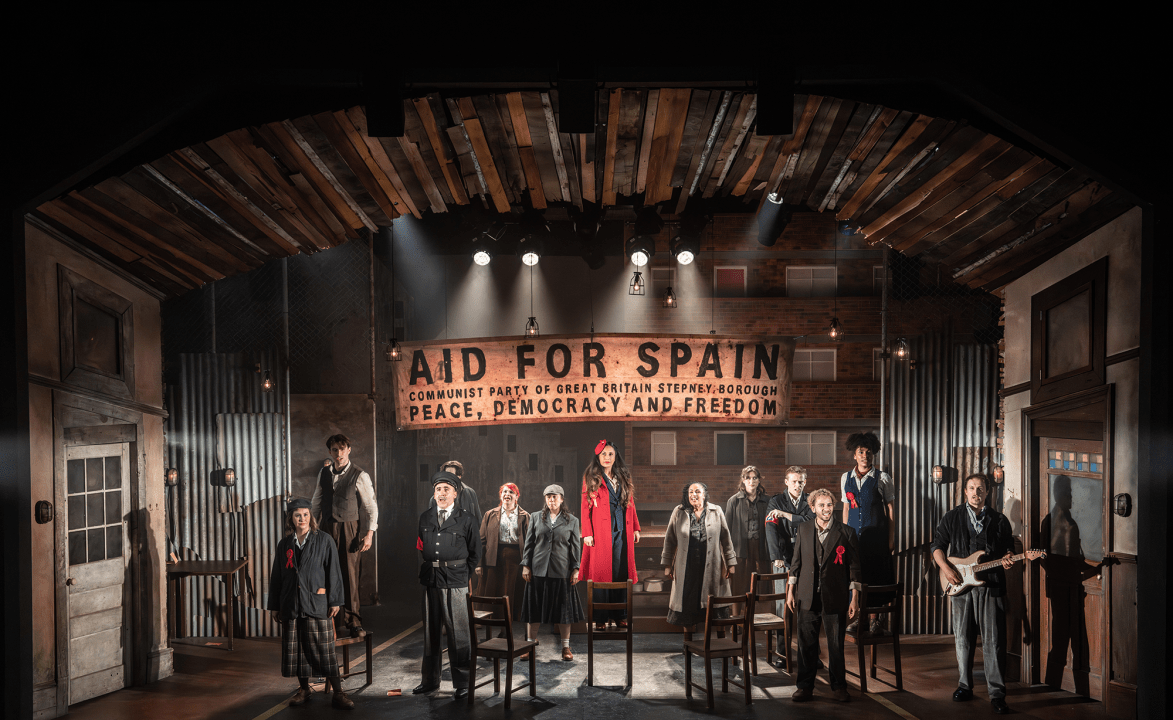 The show opens in the present day with a group of tourists being led around Cable Street by an elderly historian. After a quick change of costume, the 13 performers reappear as cockneys in the 1930s. Each actor plays several roles which blurs the  focus. We meet two large families, one Jewish, one Irish, who support the left-wing cause. Sammy is a charming young Jew who falls in love with an equally charming Irish poetess name Mairead. Both are on the same side politically which reduces the scope for conflict in their predictable, sparkless romance.