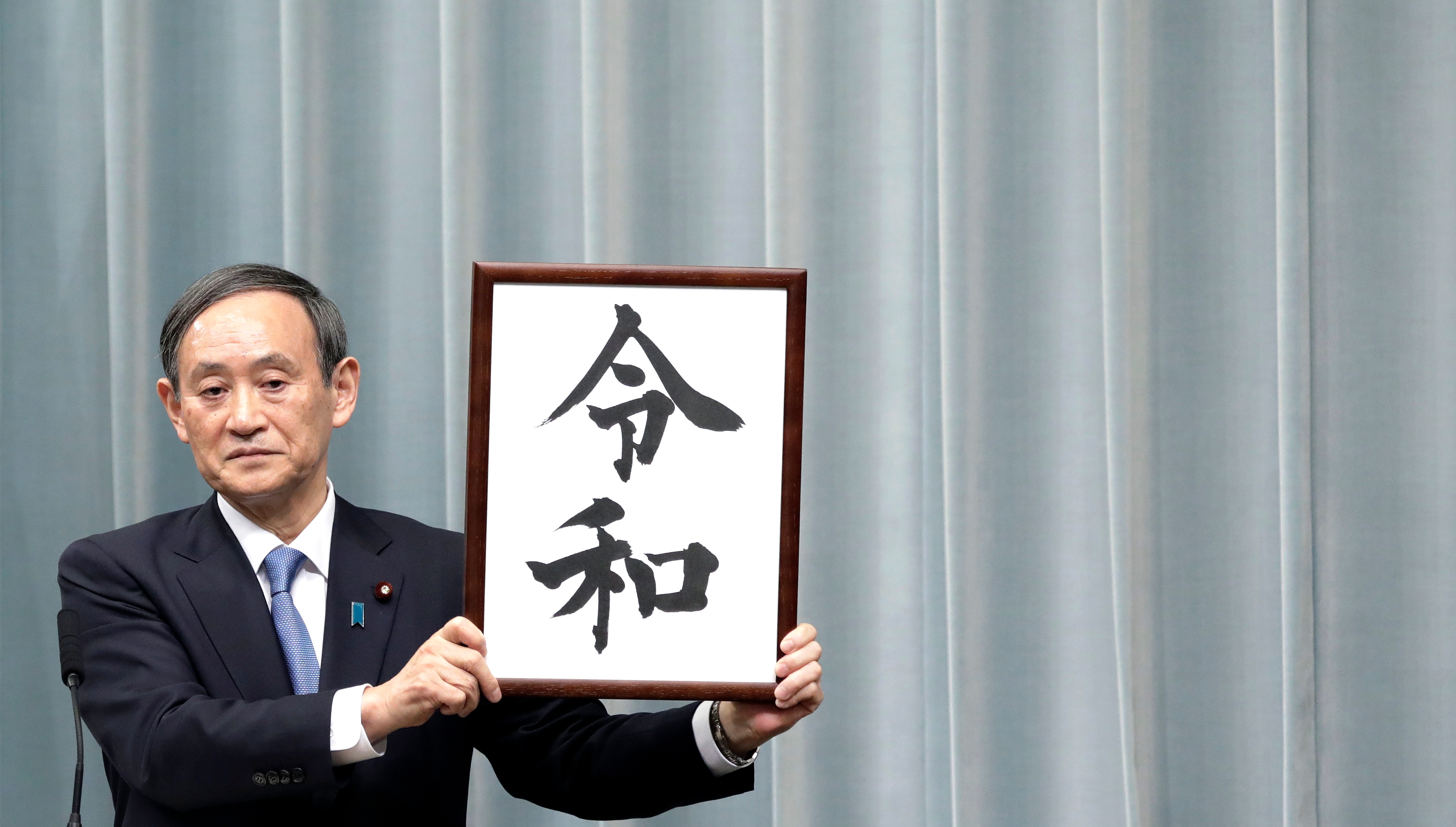 Yoshihide Suga unveiling the new imperial era of 'beautiful harmony' (Photo by Kiyoshi Ota – /Pool/Getty Images)