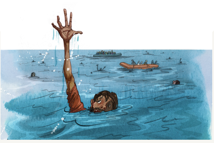 Mohammed Khaldoun felt bitter regret that he had been unable to do something to save the children. ‘I’m sorry, forgive me,’ he told their parents. ‘But I will help you now.’ He said he would swim until he found a ship to rescue everyone. ‘If I don’t come back, please take care of my mother and father.’ He took two large plastic Coke bottles that had been used to store diesel and put them under his shirt to help him float. Another man decided to join him. All anyone could see, in any direction, was water. The two men jumped in and began swimming.