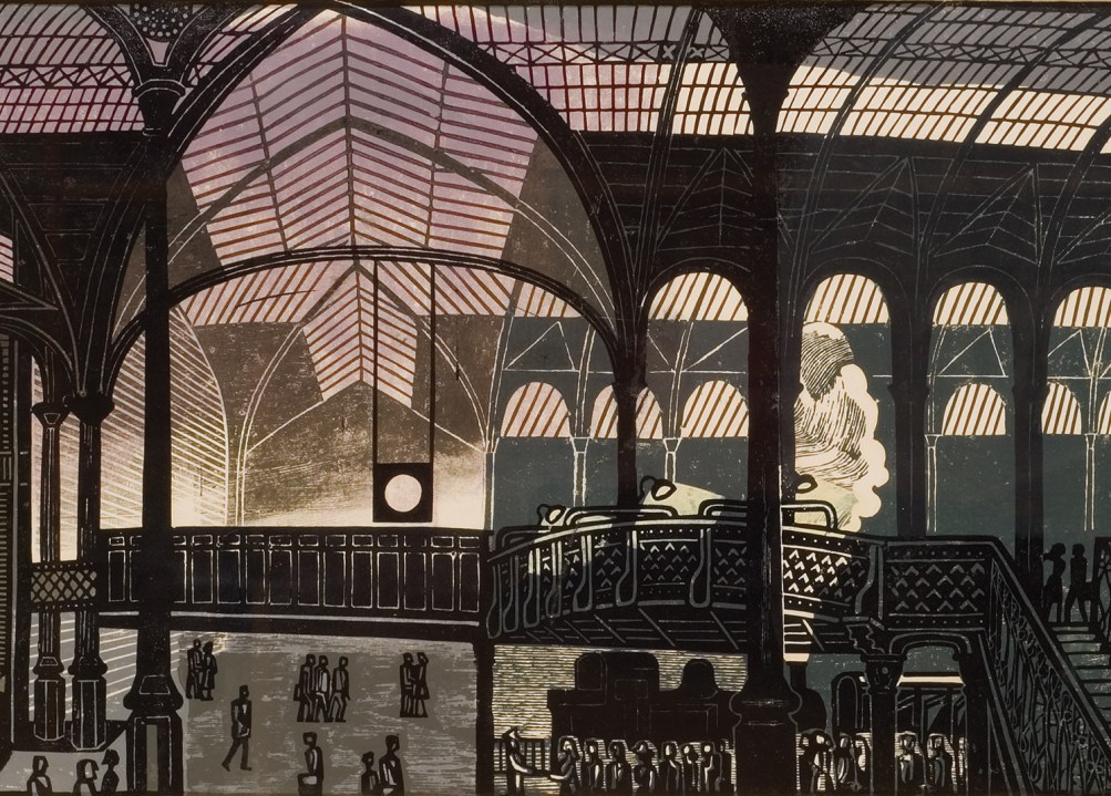 The linocut — a technique that lends itself to the creation of strong, simple forms — suited Bawden perfectly. ‘Liverpool Street Station’ (1961) is a masterpiece in that mode — a marvellous evocation of the cavernous, smoky interior of the old station before it was refurbished, in which his eye has plainly been fascinated by the latticed structure of the Victorian cast-ironwork.