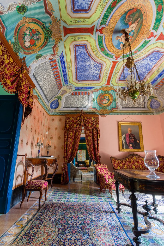 He ran his hand along a smooth column from 800 AD. “Made of lava,” he began. I spotted a period vase decorated with Alfio’s family crest, dated 1880. We passed through lounges, salons, a chapel and music rooms painted the full rainbow, draped in a riot of heavy, technicolor fabrics. Alfio’s library of around 2,000 books houses a handful dating back as far as 1497. “We have documents from the Pope as well,” he added casually, producing tea-colored papers awash with spindly cursive.
