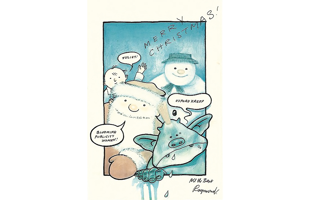 No Christmas mantelpiece in our house has ever been complete without Raymond’s advent calendar showing Santa wishing us a ‘happy blooming Christmas’. Our Christmas card from him never contained anything remotely festive. Instead we would receive therapeutic advice for counteracting the pall of gloom engulfing 25 December or a newspaper clipping about rising funeral costs captioned – in Raymond’s writing – ‘better hurry up then’. Old age and death became his inspiration. When he was awarded the Book Trust Lifetime Achievement Award in 2017, I rang up. Muttering that it had come ‘better late than never’ he refused to discuss the subject further, but I could hear him smiling.