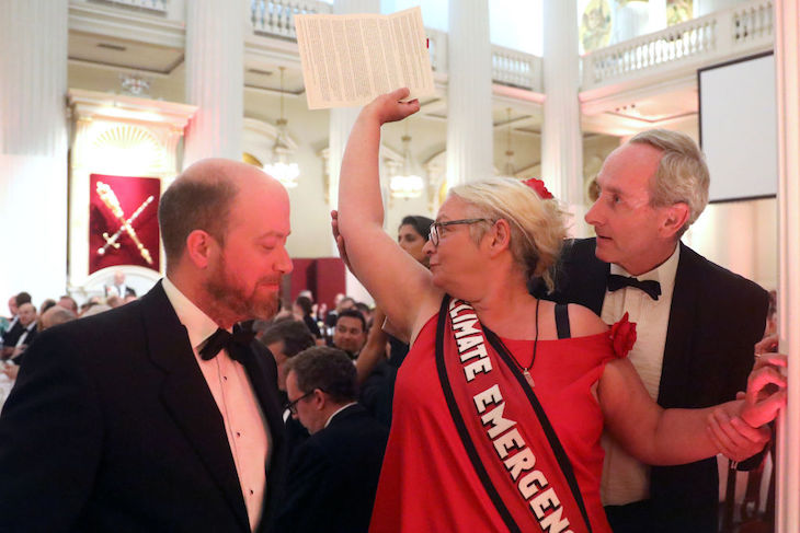 There were no police that I could see, and the light touch Mansion House security were clearly overwhelmed by the numbers. Alarmed at what was happening, and presumably fearing the Chancellor might be attacked, many guests also stood up to try and block the surging protestors from actually reaching him. What happened next was the best dressed protest I have seen: women in red ball gowns trying to push past men in black ties. The protestors shouted and shouted, reading out pre-written speeches, a loud hailer warned ‘this is a climate emergency!’, and alarms went off.