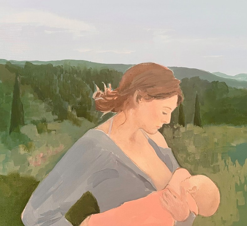 The other work is of my middle daughter standing on a terrace feeding her baby, who in the painting is about the same age (seven months) her mother was when I fought off the creep in the wheelchair.