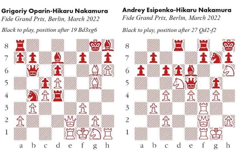 Nakamura’s greatest strength is resourcefulness under pressure. Facing 19 Bd3xg6! (see diagram above left) many players would keel over. For example, 19…hxg6 20 h7+ Kg7 21 Qe7! leads to a quick mate, or 19…fxg6 20 Qe7 Qc7 (20…Bf5 21 Bf6 is no better) 21 Re6! threatens Rxg6+. Nakamura found a way to keep things going: