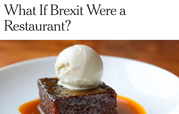 ‘Maybe the people in charge have been taking management cues from Prime Minister Theresa May’s government, which has approached its Brexit plan like a class of first graders trying to build a working jet airplane out of Lego pieces and a flying-squirrel sock puppet. Or maybe the mess back home has just sapped the restaurant’s spirit. Whatever the cause, what was meant to be a cheerful gift from London has turned into the Bluebird of Unhappiness.’