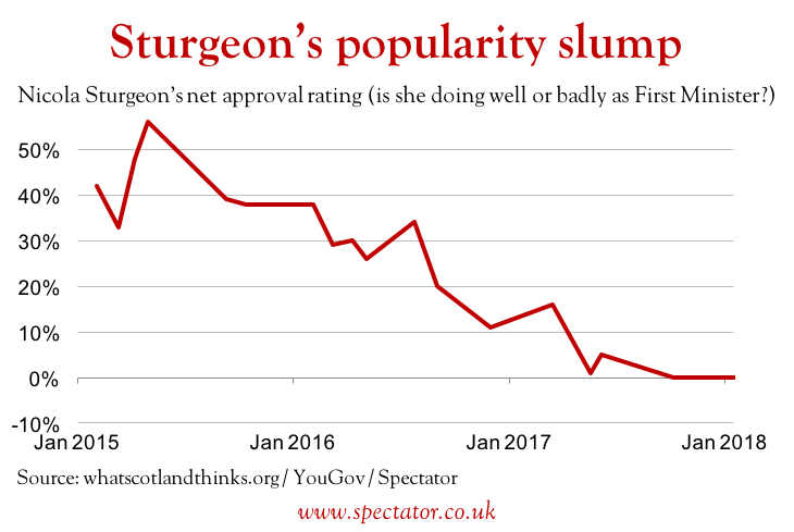 Time is beginning to run out for Nicola Sturgeon. That, at any rate, is one conclusion to be drawn from today’s YouGov poll for the Times. As many Scots now disapprove of Ms Sturgeon as approve of her and the SNP’s poll ratings continue to show no signs of benefitting from the Brexit bounce the party expected.